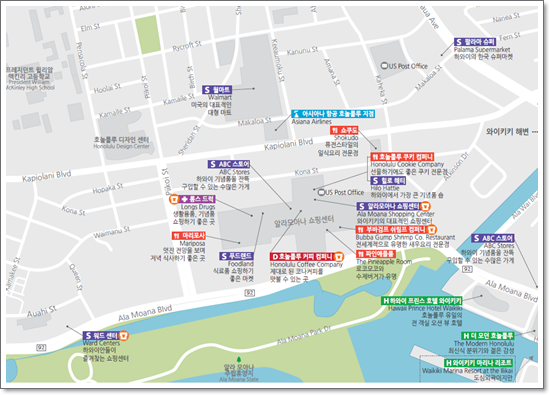 마지막 지도는 와이키키비치 지도입니다. 하와이하면 와이키키 와이키키하면 하와이가 떠오를 정도로 유명한 곳입니다.