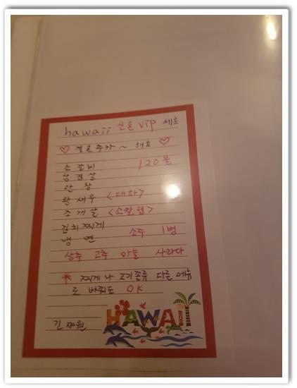 하와이 신혼 VIP 셋트는 벽에 저렇게 붙어있었습니다. 고기 구워먹고 싶을땐 좋겠던데, 우리는 오로지 찌개가 먹고싶었습니다